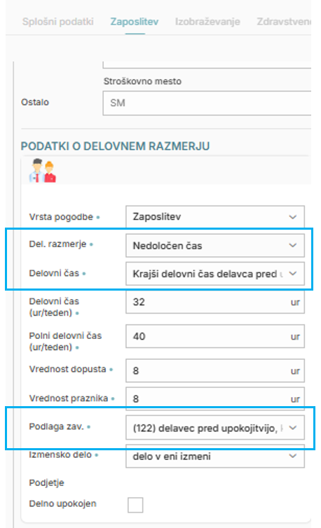 Ustrezno je potrebno nastaviti, da gre za krajši delovni čas delavca pred upokojitvijo ter zavarovalno podlago, da gre za delavca pred upokojitvijo, ki dela s krajšim delovnim časom.