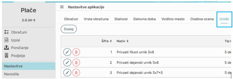 V Plačah je potrebno odpreti novo vrsto urnika. Urnik se doda na meniju »Nastavitve«, kjer se izbere zavihek »Urniki«. Pri dodajanju novega urnika se v polje »Šifra« zapiše naslednja zaporedna številka urnika. V polje »Naziv« se vpiše poljubni naziv za urnik. Potrebno je označiti tip koledarja ter izpolniti po dnevih delovni čas zaposlenega. Polje za mesečno obremenitev se izpolni v primeru fiksnega urnika oz. fiksnega urnika po dejanskih urah. Na spodnjih fotografijah je prikaz posameznih mest urejanja.