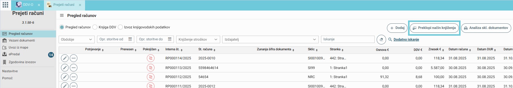 Za preklop na novo formo kliknemo na gumb »Preklopi način knjiženja«. Prav tako uporabimo omenjeni gumb, če želimo preklopiti nazaj na predhodni način knjiženja, ki smo ga imeli.