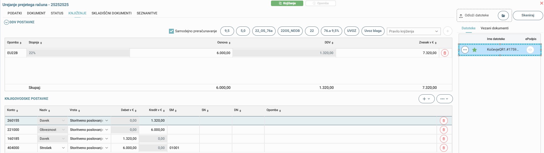 V zavihku »Knjiženje« je izboljšana preglednost ddv postavk ter knjigovodskih postavk. Ob kliku na dokument se račun v PDF obliki odpre v novem zavihku, ki ga lahko po potrebi premaknete na drug zaslon.