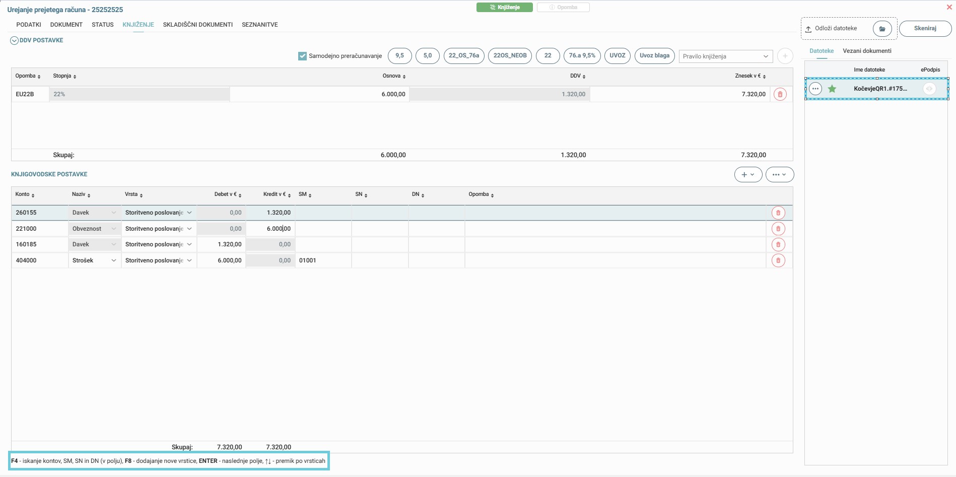 Pri knjigovodskih postavkah je omogočen popravek v vrstici. Kliknite na želeno vrstico, kjer lahko po potrebi spremenite vrednost, SM/SN ali konto.